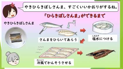 開干さんまは、スチームコンベクションで焼きます。骨のある焼き魚を初めて食べる1年生は、上手な食べ方の動画も見て味わいます。