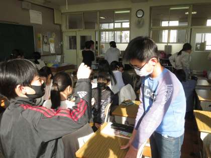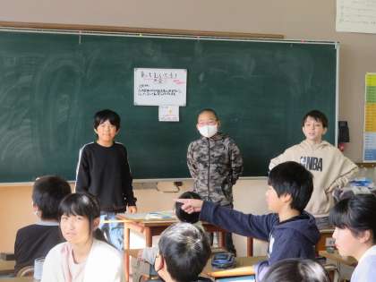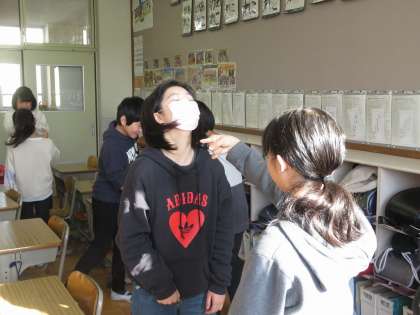 月曜日は1組のみんな遊びの日です。今回は遊び係が「あっち向いてホイ大会」を企画してくれました。写真は司会の遊び係の人たちと予選の様子です。