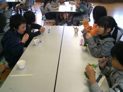 学校に帰ってから、民生委員の方々にお世話になり、とれた野菜の試食会を実施しました。