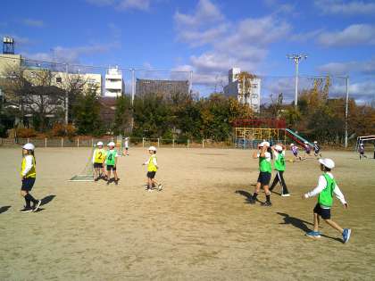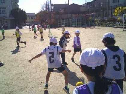 どうすれば上手にパスがつながるかを考えながら、みんなで汗をかいています。