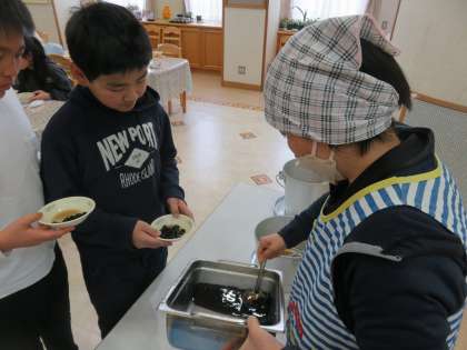 この日はランチルーム給食もありました。子ども達は、久々のランチルーム給食に楽しそうでした。給食には4時間目に勉強した「おせち料理」の煮しめと黒豆がでました。