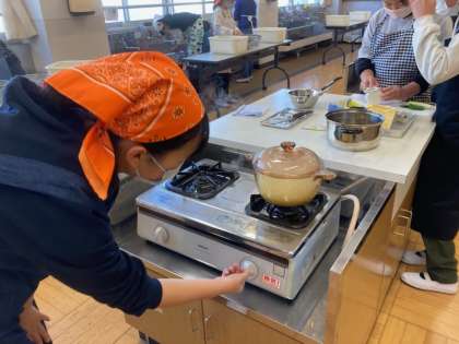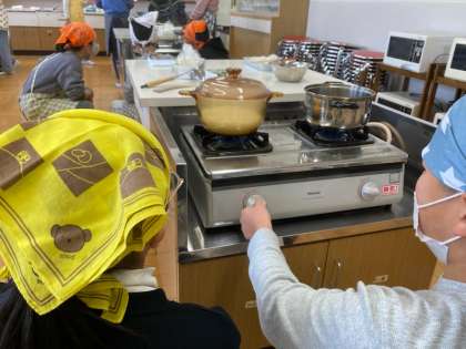 調理実習でみそ汁とご飯を作りました。最近では、ほとんどの家庭で炊飯器を使ってお米を炊きます。実習では水の量、火加減、時間に気を付けてお鍋で炊きました。お米の変化にも注目します。