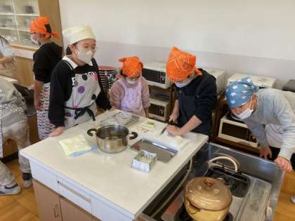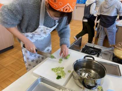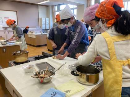 みそ汁は煮干しからだしをとり、そのの良さに気付いたり、食材にあわせて切ったりしながら実習を進めました。家庭科室にはだしや、味噌のいい香りが漂っていました。、