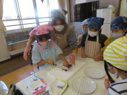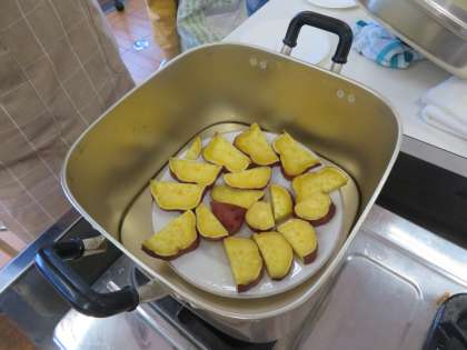 生活科で育てたサツマイモをふかして食べました。地域の民生委員さんにお手伝いいただいて、自分たちで包丁を使ってサツマイモを切りました。どのグループもおいしくできました。
