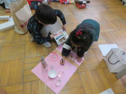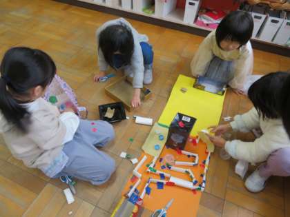 お家から集めていただいた材料を使って、おもちゃを作っています。それぞれのグループが協力しながら作りました。完成までは、もう少しかかりそうです。