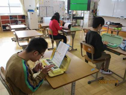 練習時間は3分で良いという子どもたち。元気な「せ〜の。」の後に喜びの歌の合奏がスタート。鍵盤ハーモニカ・リコーダー・ピアノで合奏します。とても上手です。