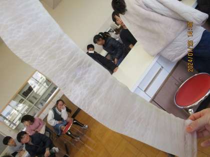 難なくされているようでしたが、そのような技術の1つ1つが長い時間の中、鍛錬と失敗を重ねて完成しているということも話して下さいました。写真は歴史が刻まれた、田村さんの「手」を、見せてもらう子ども達です。