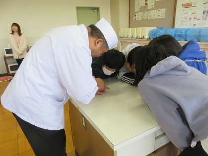 田村さんの「かつらむき」は、向こう側が透けて見える「薄さ」です。手元を見なくても包丁や食材を自在に操る様子に、子ども達からは歓声が上がっていました。
