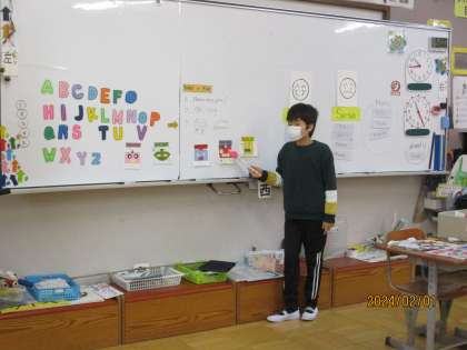 もうすぐ節分。四角形・三角形・円の言い方を学習し,「please〜。」と色画用紙を受け取り,すてきな鬼を作りました。