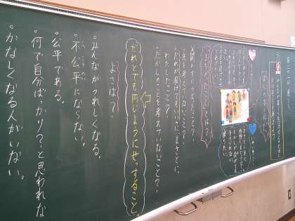 「どうして誰にでも同じように接することが大切なのか。」ということをみんなで話し合うと、「みんながうれしくなるから。」「誰も悲しくならないから。」など、さまざまな意見が出てきました。