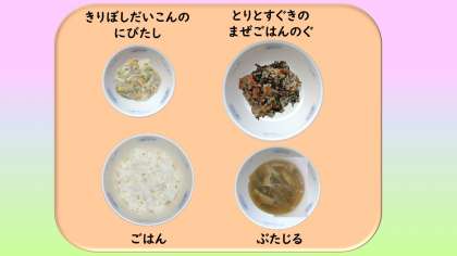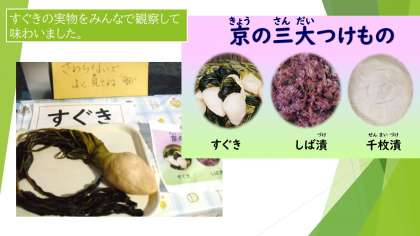 京都三大漬物の「すぐき」を混ぜご飯で味わいます。1年生は、すぐきの実物を観察してから、すぐきができるようすの動画を見て学びながら味わいました。