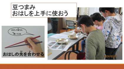 「上手にお箸を持てたよ!」「大豆ってつまみにくいね」「家でも練習したい!」と、お箸の持ち方に関心が持てたようでした。