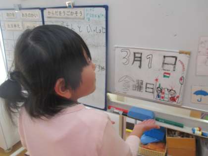 教室の予定表や日付は子どもたちが毎日書いています。今日は、ひなまつり献立ということもあり、4年生がかわいらしい雛人形を描いてくれました。その絵を3年生が説明してくれている写真です。いつもかわいい絵をありがとう。