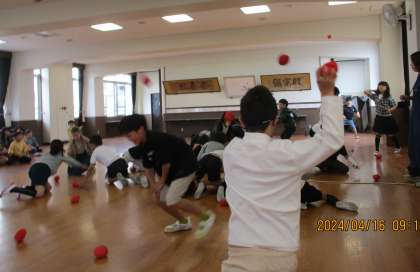 「どっちが多い?」ゲーム。玉入れの玉を使って、1組、2組、なかよしのみんなで対戦しました。結果は、1対1の引き分け。ルールを守っておもしろい活動ができました。