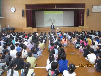 体育館に集まって憲法朝会を行いました。校長先生や杉山先生、上級生のお話をしっかりと聞くことができました。