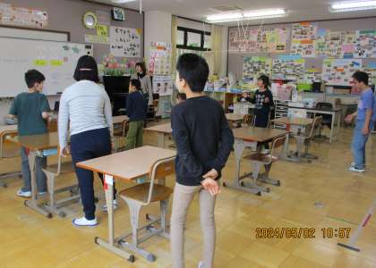 今年度、初めてのALTケイリー先生との外国語の時間。今日は、自己紹介カードを使って「Hello.My name is ○○.I like ○○.Nice to meet you!」とあいさつしました。自分の好きなものを紹介すると、ケイリー先生も、「Me,too.」と返してくれました。みんな、自分と同じものが好きだということがわかって、とっても嬉しそう。ケイリー先生は、得意の絵でも好きなものを教えてくれました。Very good!!