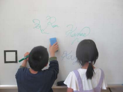 6年生が、自分のサインを書いているのを見て、「私も書きたい。」と自分のサインを考え始めた下級生。先生も、子どものころ自分のサインをよく考えていました。