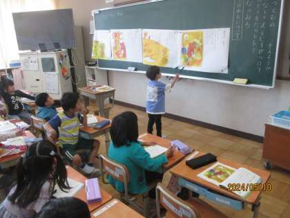 ひとつめの場面でものがたりと絵を結び付けて、学習集をすすめました。