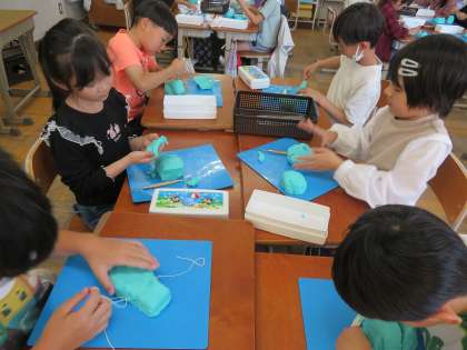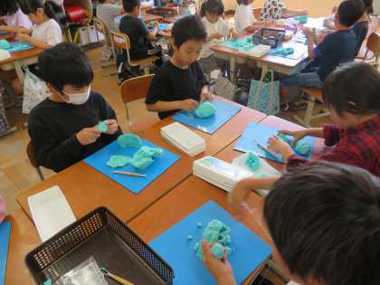 「切って かき出し くっつけて」の学習では、かきべらや切り糸を使って作品を作りました。新しい道具を使って、楽しんで取り組めました。