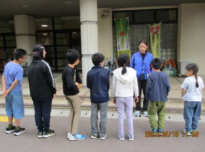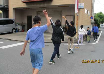 校区散歩の際は、横断歩道のない道を、右左と見て確かめてから、手を挙げて渡ることができました。西町公園で少しだけ遊具を楽しんで安全に学校に到着。ベリーグー!!