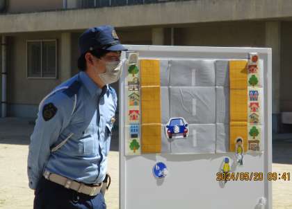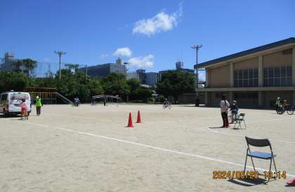 2,3時間目に、自転車教室がありました。警察署から指導員の方が来てくださり、交通ルールについてお話を聞きました。それから、自転車に乗って、横断歩道や信号、標識などを見ながら実技体験をしました。安全に気をつけて自転車に乗ろうと、みんな気持ちを新たにふりかえっていました。