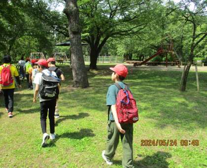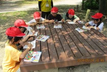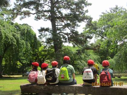 なかよし学級では、24日に京都御苑へ行きました。新緑が美しく、心地よい風が吹く中、公園で友達と声をかけあって活動しました。初夏の季節でも落ち葉がたくさん落ちていて、何枚か拾い、和紙に写し絵をしました。それぞれ、思い思いに色鉛筆を選び、持ち方を工夫しながらサラサラと描いていました。