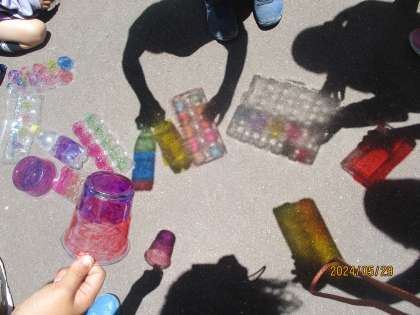 図画工作で「ひかりのプレゼント」の学習をしました。たまごのパックや,ペットボトルに色をぬったり,ナイロンを貼ったりしました。光にかざすととてもきれいに輝いていました。