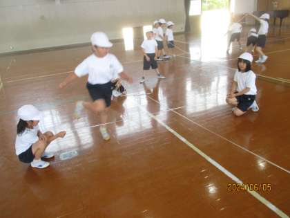 なわやロープを使って、高くに跳んだり遠くに跳んだりしました。