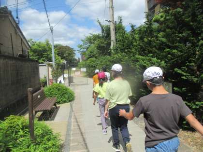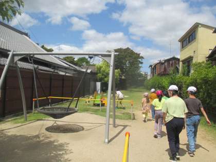 今日は、一番新しい仁和公園へ行ってきました。大きなブランコのある公園です。道中は細い道もあり、車やバイク、自転車が通るので、先頭の友達は、車が来ることを後ろの友達に伝えたり、「右に寄ろう。」「前に行ってね。」等安全に気を付けて校区を歩くことができました。