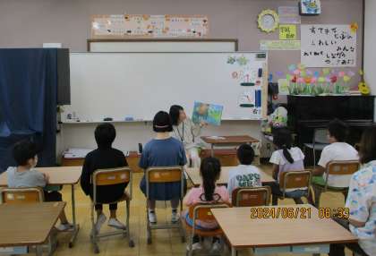 雨が残る少し涼しい今朝、いそいそと椅子を用意して、中野教頭先生による絵本の読み聞かせの時間を楽しみました。本の題名は「あめのひのただいま」。大雨が降っても、友達に助けてもらったり、協力して何とか家に帰りついたり、荷物を運んでもらったりしているネズミさんたちの話に、ほっこり嬉しい気持ちになりました。