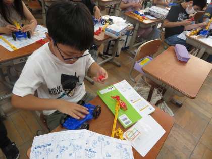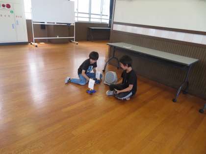理科の学習で、風を受けて走る車を作りました。風を受けて走る様子に子どもたちも大喜びでした。