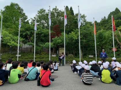 一緒に宿泊した学校の一つ、上高野小学校と合同朝の集いを行いました。互いに学校紹介を聞き合いました。