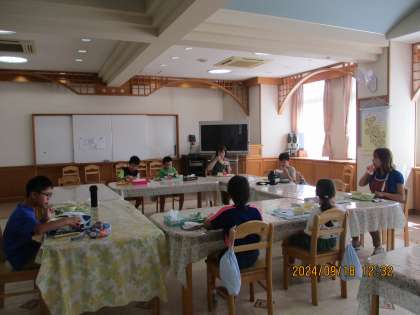 今日は、村山先生と一緒に食の学習をしてから、ランチルームでの給食時間でした。ランチルームは特別な空間。天井も広く、きれいな壁の色で、おいしい給食がもっともっとおいしく感じられます。時計にも魔法がかかって、心おどる時間でした。