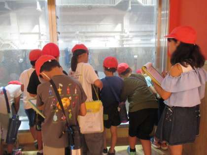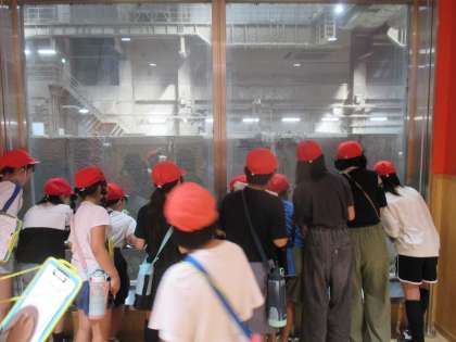 ゴミをクレーンを使って運んでいく様子を見学しています。