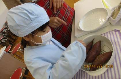 ふかしたさつまいもに火が通ったか、確かめる→食べやすい大きさに切る(高学年)→試食→片付ける