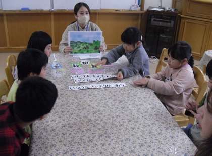 ランチルームで、栄養教諭の坂本先生と食の学習をしました。季節の野菜、旬について学びました。旬の野菜は「おいしい」「たくさん収穫できる」「栄養がたっぷり」なことを、野菜たちから教えてもらいました。その後のランチタイムでは、「野菜をもりもり食べて、元気いっぱいになる!」ともりもり昼食を食べていましたよ。