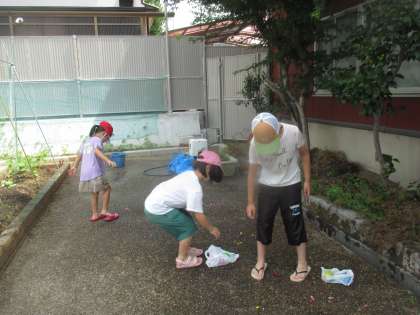 今日は、日陰で水遊びをしました。協力して水風船に水を入れ、結んで水風船を用意しました。大事に大事にしていた水風船ですが、投げるとなると豪快で、「もっと遊びたい。」と明日を楽しみにする子ども達でした。割れた風船のごみも1つ残らず片づけることができました。