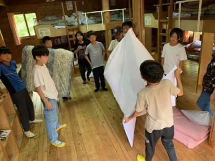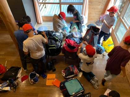 さて、宿泊するロッジに入って、色々な準備をしなければなりません。夜ご飯セットと入浴セットを準備して、布団にシーツをかけて寝具準備しました。自分でしおりを読みこんだり、互いに声を掛け合ったりしていました。生活係が中心となり、みんなで協力する姿が見られました。