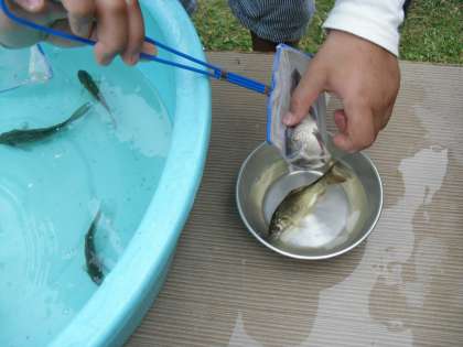 魚やザリガニを網ですくったり,手で触ったりできるコーナーは,特に人気があり,何度も挑戦していました。