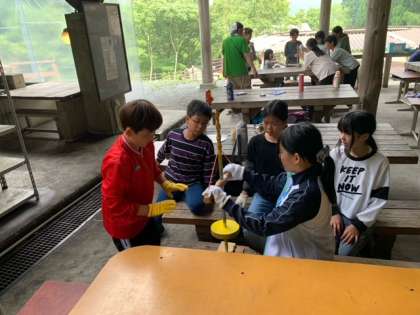 火起こしに挑戦しました。雨上がりで湿気が多く、条件は良くなかったですが、みんなで協力し、全ての班が火をつけることが出来ました。この火を使って野外炊事をします。
