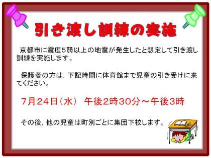 先日,配布しました案内のように引き渡し訓練を実施します。児童の引き受けにお越しください。