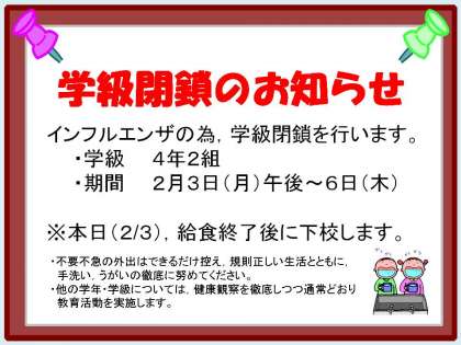インフルエンザの為,学級閉鎖を行います。