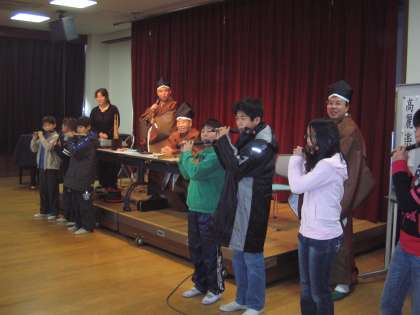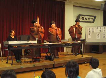 1月18日(月)地域の方々にお世話になり5・6年生を対象に雅楽鑑賞教室を実施しました。りゅうてき・しちりき・しょうなどの楽器や雅楽について分かりやすく説明していただきました。また,その説明の後,代表の児童,学校長,担任が教えをこいながら実際に楽器を使わせていただき,素晴らしい音色?を奏でていました。また,日本の楽器とキーボード(キーボードは,調をかえて演奏しなければならないそうです)を使って素晴らしい演奏を聴かせていただきました。子どもたちの心も安らいだことでしょう。貴重な体験ありがとうございました。