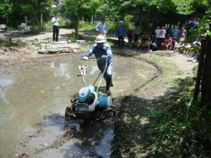 5月28日(水)は,田おこしと代かきを行いました。どちらも耕運機を使っての作業になるので,子どもたちは見学するだけでしたが,硬かった土が耕され,その後水を張って田んぼらしくなると,歓声が上がりました。最後に代かきの作業をしていただいて田植えの準備は完了です。