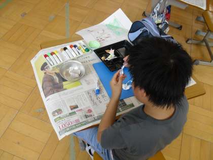 図画工作の授業で,お母さんのためにお弁当をつくりました。空のお弁当の容器に,紙ねんどと絵の具を練り合わせておかずをたくさんつくり,お弁当箱に詰めました。うめぼしやたまごやき、キムチ入りからあげなどおいしそうなおかずでいっぱいになりました。「お母さんの好きな食べ物をいっぱい入れよう。」「お母さんにありがとうと伝えたいな。」と言いながら,思いを込めて完成させることができました。