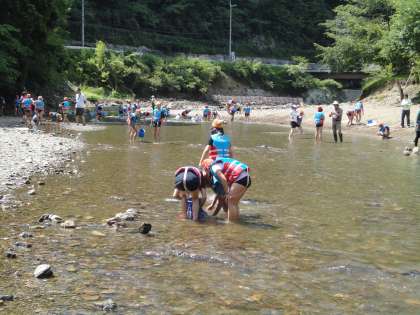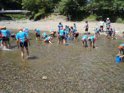 第2日目の午後は交流の森で川遊びをしました。昨年の大雨で流れが変わってしまい、浅瀬が増えています。小魚が群れを成して泳いでいたり、オタマジャクシがたくさんいたりと様々な生き物のが見られました。川の水がとても気持ちよかったです。