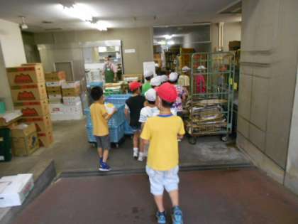 見学では,普段は見られないお店の裏側を見せていただいたり,お店の方にお話を聞いたりしました。子どもたちは,「品物ごとに棚をわけて商品を見つけやすくしている。」,「たくさんの種類を置いて好きなものが買えるようにしている。」,「旬のものを目立つところに並べている。」など,いろいろな工夫に気づくことができました。