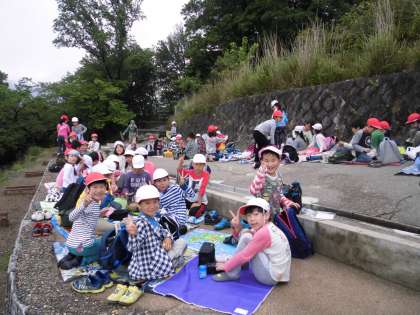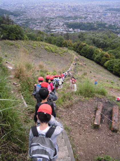 今日は遠足で,大文字山に登りました。お天気があやしかったのですが,朝は涼しく,昼はさわやかに過ごすことができました。上りはとてもしんどくて,途中で休憩もとりながら登りました。「大」の字のところで,「学校見えるかなあ。」(残念ながら見つけられませんでした)と京都市の町の様子を見たり,方角をたしかめたりして,京都の町のことを学ぶことができました。お家の人に作ってもらったお弁当も美味しくいただきました!