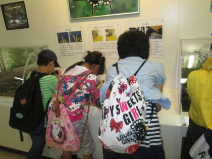 上京支部の友だちと一緒にバスに乗り,藤森にある科学センターへ行きました。バスの中では王様が登場して,ゲーム「おちたおちた」で盛り上がりました。あいにくの雨で屋外展示はありませんでしたが,室内展示をみんなで楽しみました。大きなティラノザウルスの模型にびっくりして驚きの声をあげていました。その後は蝶のたまごを顕微鏡で見ました。