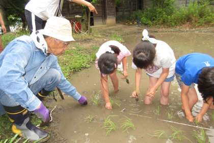6月5日(金)に,ゆめの森の田んぼで田植えをしました。地域のお米の先生に,苗の持ち方や植え方を教えていただきながら,一株一株心をこめて植えていきました。最初に田んぼに入るときは,恐る恐る足をふみ入れていた子どもたちですが,2回,3回と入るうちに,歩き方や植え方も上手になっていきました。